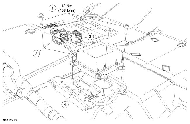 1. WARNING: Always tighten the fasteners of the restraints control module (RCM) and impact sensor (if equipped) to the specified torque. Failure to do so may result in incorrect restraint system operation, which increases the risk of personal injury or death in a crash.