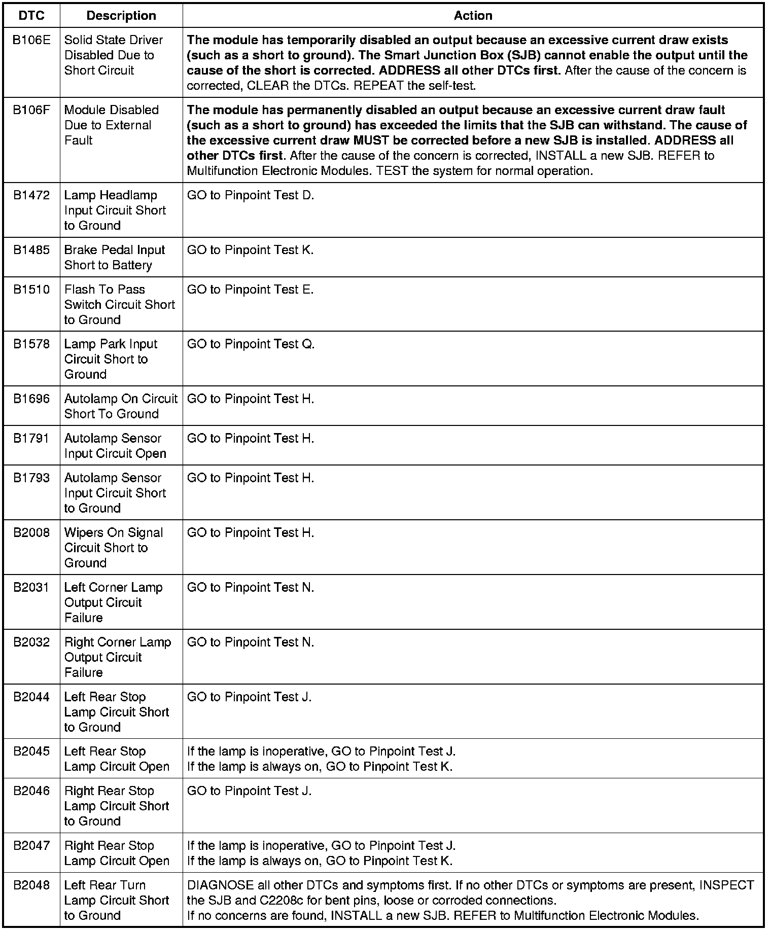 Smart Junction Box (SJB) DTC Chart