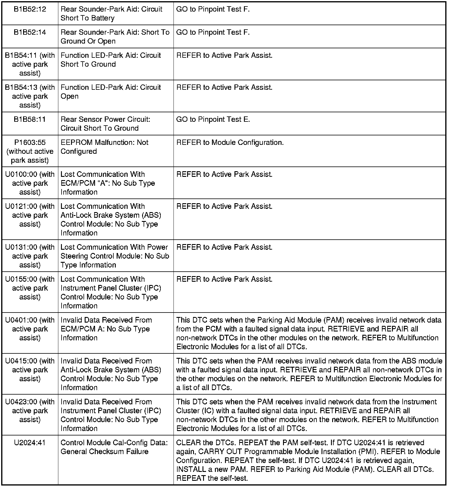 Parking Aid Module (PAM) DTC Chart