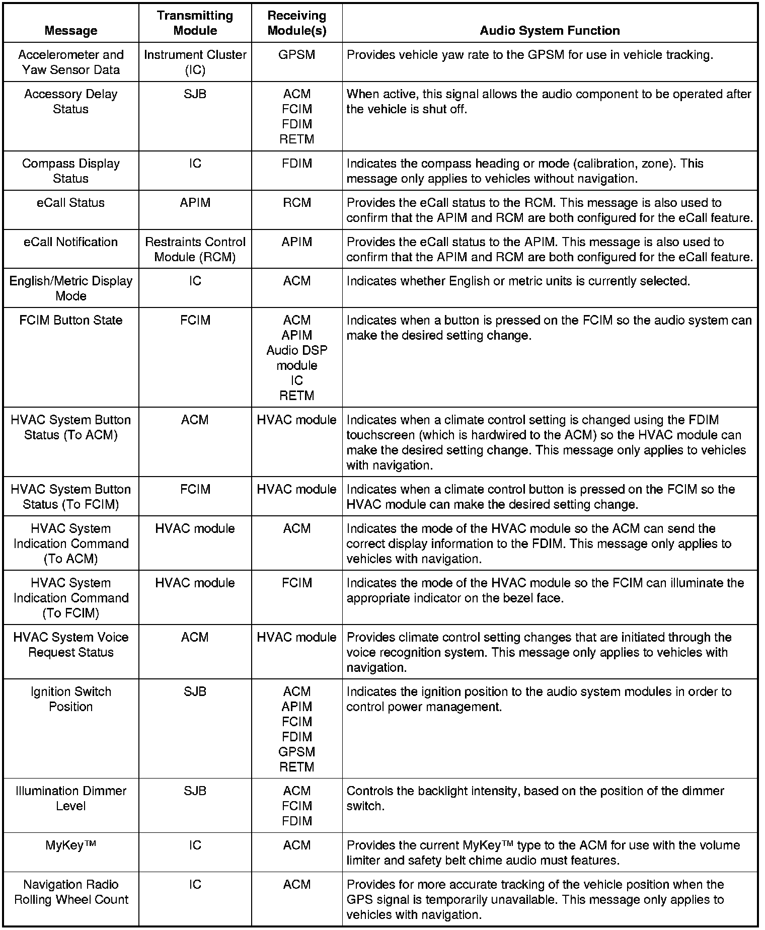 When the audio system enters voice recognition mode, the ACM initially controls the voice recognition feature. The microphone is wired directly to the APIM, which relays the microphone input to the ACM through dedicated wiring. If the first command spoken is part of the ACM voice recognition set, the ACM retains control of the voice recognition and takes the appropriate action(s). If the first command spoken is part of the APIM voice recognition set, the ACM shuts off its own voice recognition and broadcasts a Controller Area Network (CAN) message to the APIM, transferring the voice recognition to the SYNC system and providing the voice command that was spoken. The ACM controls the voice engine for the base audio, navigation, and climate control systems. The APIM controls the voice engine for the SYNC system (USB port, audio input jack, Bluetooth).