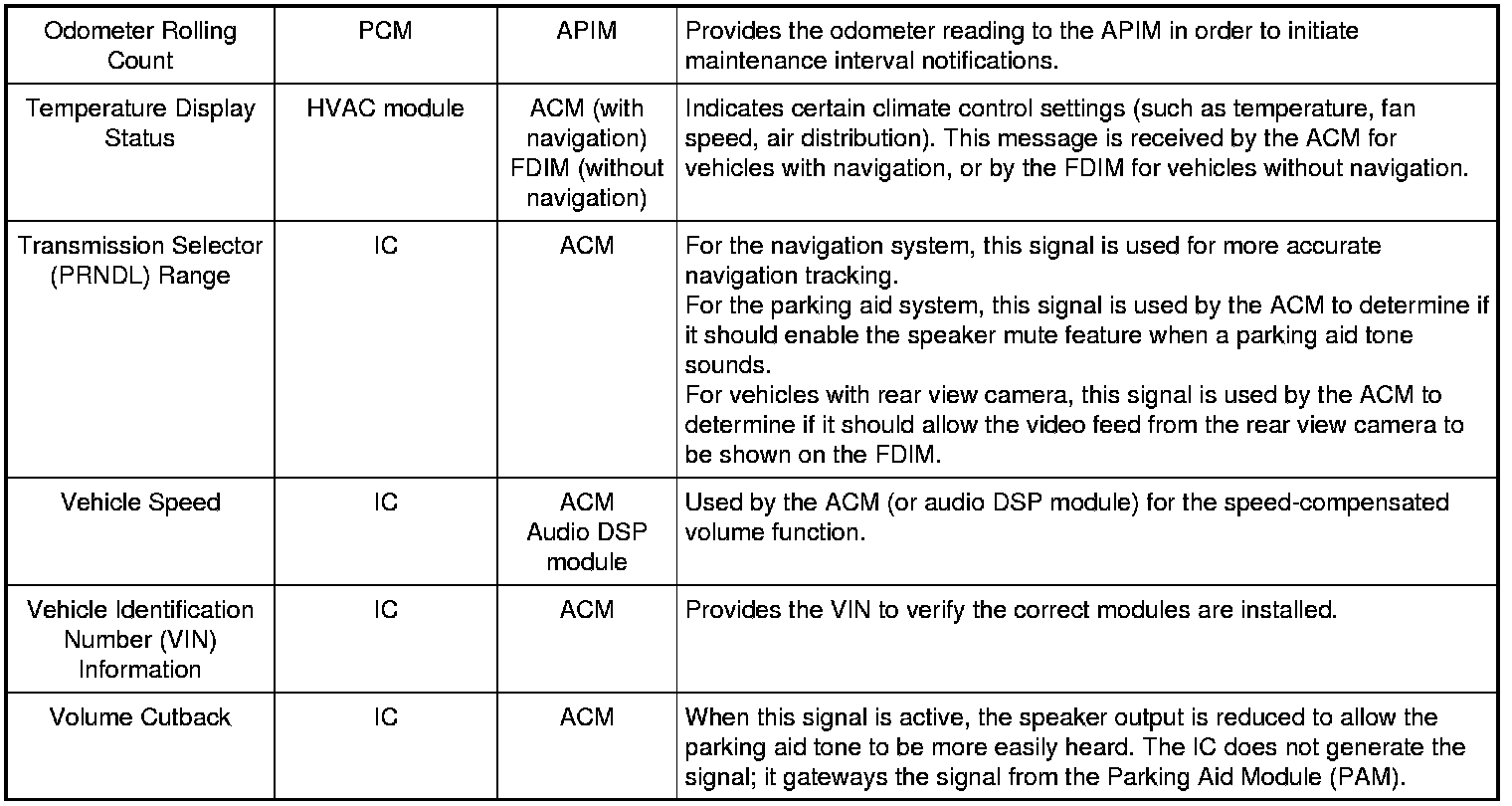 For vehicles with navigation, the FDIM is hardwired to the ACM. When the touchscreen is pressed, a signal is sent to the ACM, which acts on the signal either by changing the audio setting or by sending a message via the MS-CAN to the module controlling the function that was selected. The audio system, navigation, and climate control video feed to the FDIM is provided by the ACM. If equipped with a rear view camera, the video feed for the camera is provided by the rear view camera.