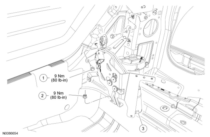 4. Remove the power liftgate motor bracket retaining bolts and nut.