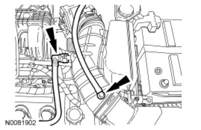 11. Remove the vacuum hose and the evaporator purge solenoid hose from the upper intake manifold and position aside.