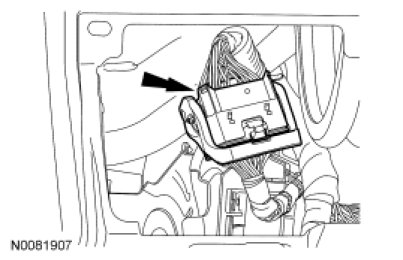 31. Disconnect the Restraints Control Module (RCM) small electrical connector and detach the 2 wire harness pin-type retainers.
