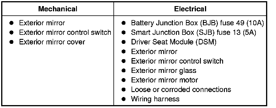 10. If no DTCs related to the concern are retrieved, GO to Symptom Chart - Exterior Mirrors or GO to Symptom Chart - NVH. Symptom Chart - Exterior Mirrors Symptom Chart - NVH