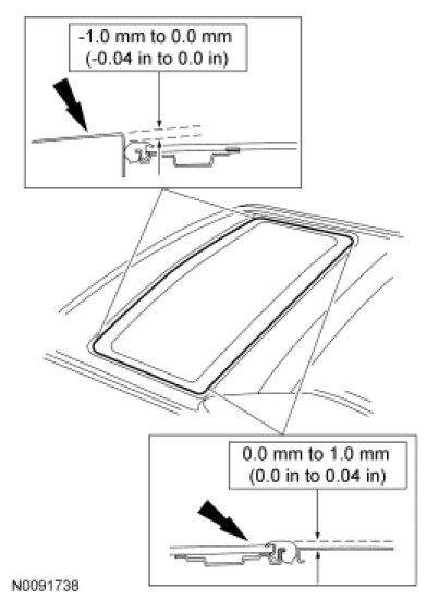 3. Make sure the roof opening panel is centered in the roof opening. Adjust the roof opening panel glass height to specification.