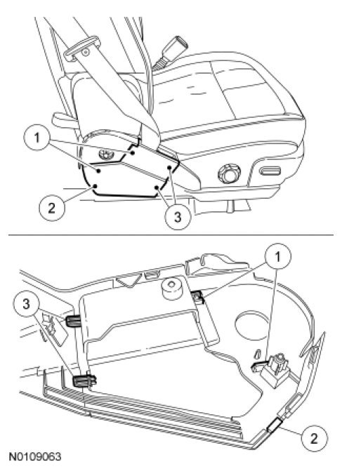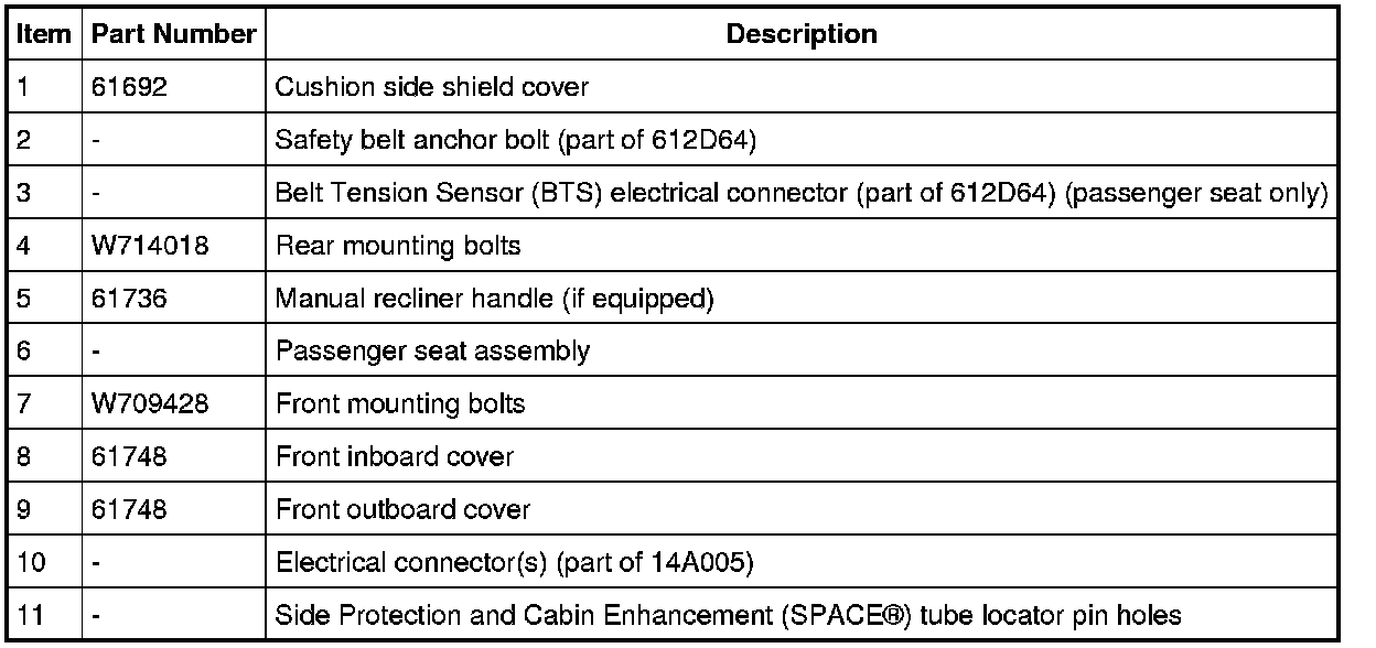 13. WARNING: Use care when handling the front passenger seat and track assembly. Dropping the assembly, placing excessive weight on or sitting on a front passenger seat that is not secured in the vehicle may result in damaged seat components. Failure to follow these instructions may result in incorrect operation of the occupant classification sensor (OCS) system and increases the risk of serious personal injury or death in a crash.