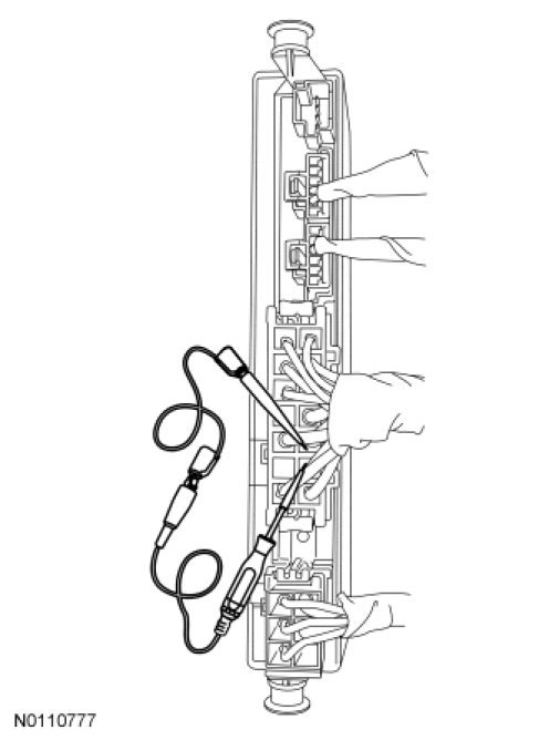 NOTICE: The following pinpoint test uses a test light to simulate normal circuit loads. Use only the test light recommended in the Special Tools table. To avoid connector terminal damage, use the Flex Probe Kit for the test light probe connection to the vehicle. Do not use the test light probe directly on any connector.
