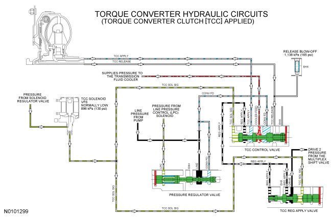 When the TCC clutch is applied the TCC solenoid applies pressure to the TCC control and regulator apply valves. The TCC control valve directs the CONV FD circuit to the COOLER FEED circuit.
