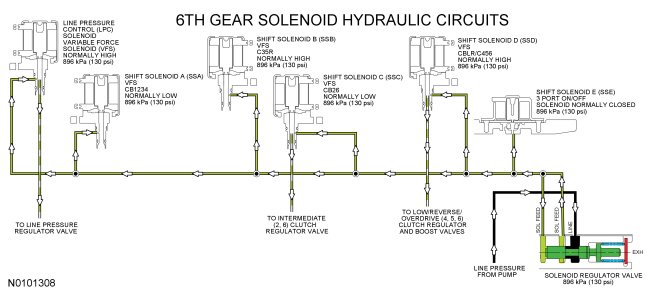 In 5th gear, the overdrive (4, 5, 6) clutch remains applied. SSA releases pressure to the forward (1, 2, 3, 4) regulator and boost valves. SSB directs pressure to the direct (3, 5, R) regulator and boost valves through the SSB SIG hydraulic circuit to apply the direct (3, 5, R) clutch.