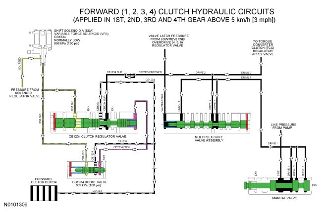 When the forward (1, 2, 3, 4) clutch is applied in 1st (above 5 km/h [3 mph]), 2nd, 3rd and 4th gears, LINE pressure from the pump is directed to the multiplex shift valve by the manual valve through the DRIVE 1 hydraulic circuit. The multiplex shift valve supplies the forward (1, 2, 3, 4) clutch regulator valve with pressure through the DRIVE 2, CB26FD/CB1234FD and CB1234 SUP hydraulic circuits. The forward (1, 2, 3, 4) clutch regulator valve directs regulated pressure to the forward (1, 2, 3, 4) clutch through the CB1234 hydraulic circuit.