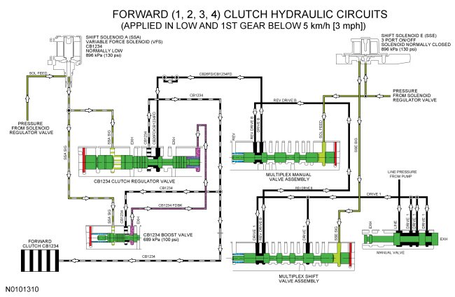 When the forward (1, 2, 3, 4) clutch is applied in LOW position and 1st gear (below 5 km/h [3 mph]), LINE pressure from the pump is directed to the multiplex shift valve by the manual valve through the DRIVE 1 hydraulic circuit. The multiplex shift valve directs the pressure to the multiplex manual valve through the REV DRIVE B circuit. The multiplex manual valve directs the REV DRIVE B pressure to the forward (1, 2, 3, 4) clutch regulator valve through the DRIVE B, CB26FD/CB1234FD and CB1234 SUP circuits. SSA supplies varying solenoid pressure to the CB1234 clutch regulator and boost valves. As the CB1234 clutch regulator valve moves, it supplies the forward (1, 2, 3, 4) clutch and CB1234 boost valve with regulated line pressure through the CB1234 circuit. The CB1234 boost valve directs the regulated line pressure to the opposite side of the regulator valve through the CB1234 FDBK circuit for gradual forward (1, 2, 3, 4) clutch engagement.