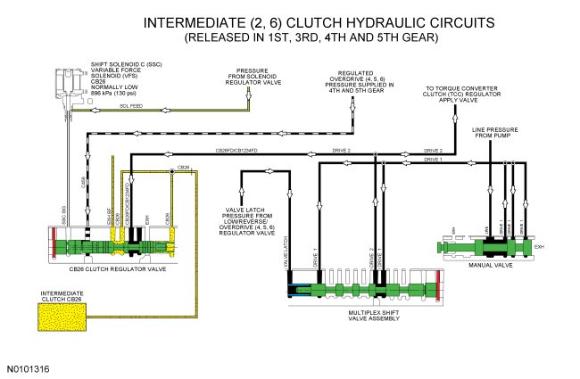 When the intermediate (2, 6) clutch is applied in 2nd and 6th gears, LINE pressure from the pump is directed to the multiplex shift valve by the manual valve through the DRIVE 1 hydraulic circuit. The multiplex shift valve supplies the intermediate (2, 6) clutch regulator valve with pressure through the DRIVE 2 and CB26FD/CB1234FD hydraulic circuits. The intermediate (2, 6) clutch regulator valve is controlled by SSC and directs regulated pressure to the intermediate (2, 6) clutch through the CB26 hydraulic circuit. The CB26 hydraulic circuit also supplies pressure to the opposite side of the CB26 clutch regulator valve for gradual intermediate (2, 6) clutch engagement. Regulated overdrive (4, 5, 6) clutch pressure is supplied to the intermediate (2, 6) clutch regulator valve in 6th gear to boost the SSC solenoid pressure.