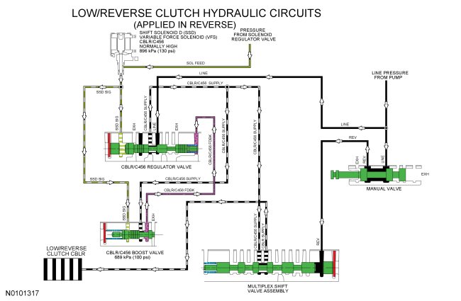 When the low/reverse clutch is applied in REVERSE, LINE pressure from the pump is directed to the multiplex shift valve by the manual valve through the REV hydraulic circuit to move the valve. Line pressure is also supplied to the low/reverse/overdrive (4, 5, 6) clutch regulator valve from the pump. The low/reverse/overdrive (4, 5, 6) clutch regulator valve is controlled by SSD and directs regulated pressure to the multiplex shift valve. The multiplex shift valve directs the regulated pressure to the low/reverse clutch through the CBLR SUPPLY circuit.