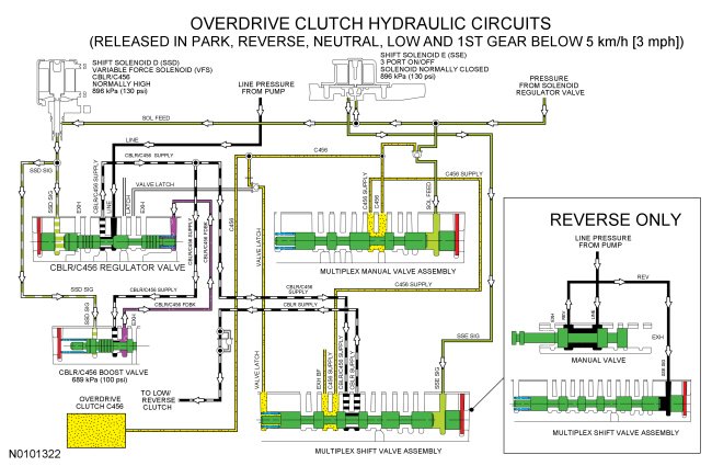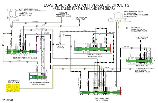 When the overdrive (4, 5, 6) clutch is released in PARK, REVERSE, NEUTRAL, 1st gear (below 5 km/h [3 mph]) and LOW position, LINE pressure is supplied to the low/reverse/overdrive (4, 5, 6) clutch regulator valve from the pump. The low/reverse/overdrive (4, 5, 6) clutch regulator valve is controlled by SSD and directs regulated pressure to the multiplex shift valve through the CBLR/C456 SUPPLY hydraulic circuit. The multiplex shift valve directs the regulated pressure to the low/reverse clutch through the CBLR SUPPLY hydraulic circuit.