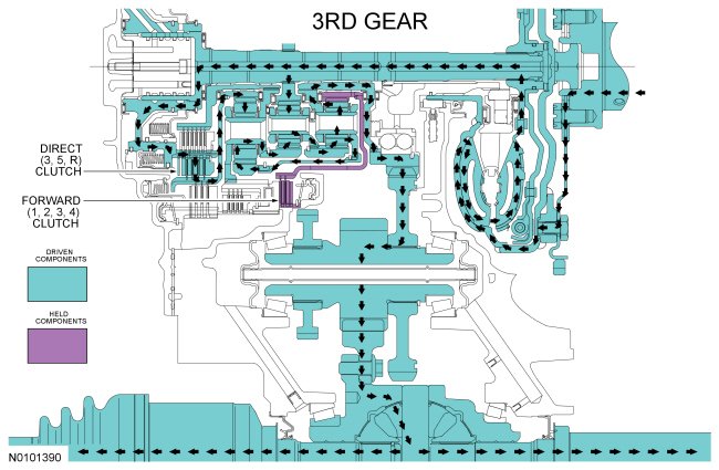 NOTE: The transaxle operates differently in first gear above and below 5 km/h (3 mph). For transaxle operation above 5 km/h (3 mph), refer to 1st Gear Above 5 km/h (3 mph).