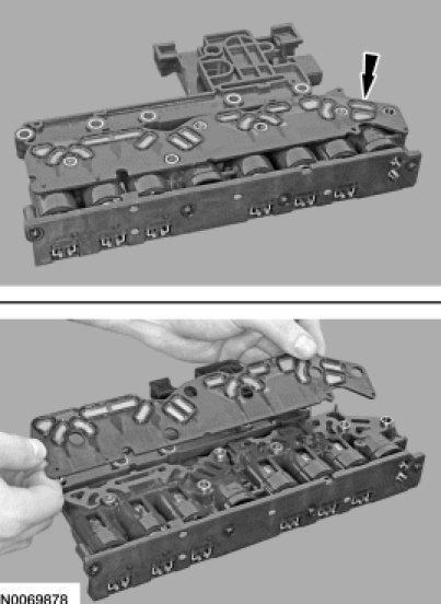 NOTICE: Use care not to break the alignment tabs when installing the solenoid body filter. Damage to the transaxle will occur if the solenoid body is not correctly aligned.
