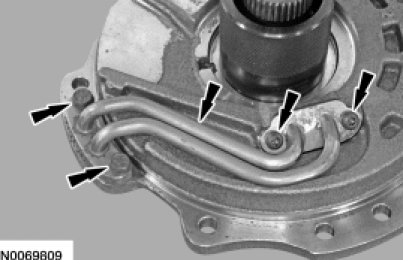 8. Tighten the 2 stator support feed tube Torx head bolts.