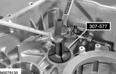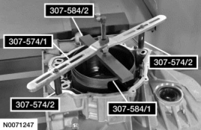 1. Position the Differential Bearing Cup Remover 307-586 in the transaxle case with the tabs on the Differential Bearing Cup Remover 307-586 aligned with the slots in the transaxle case.