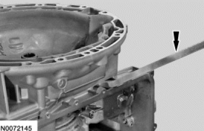 45. NOTICE: Carefully pry on the transaxle torque converter housing and the case to separate the torque converter housing from the case. Do not pry up on the silicone sealant mating surfaces, damage to the mating surfaces may occur. Carefully lift the torque converter housing off the dowel pins.
