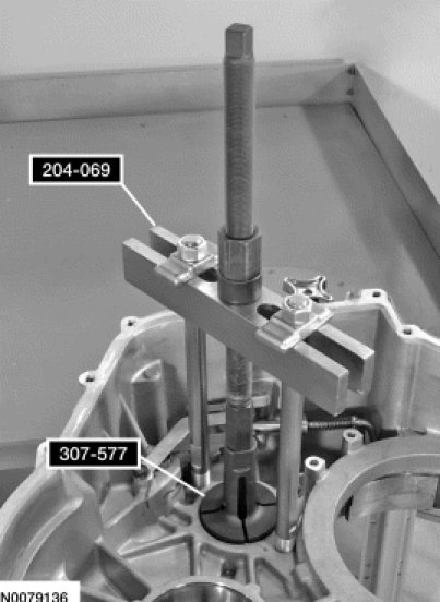 75. Using a wrench, turn the nut on the Front Wheel Hub Remover/Installer 204-069 to remove the transfer shaft bearing cup from the torque converter housing.