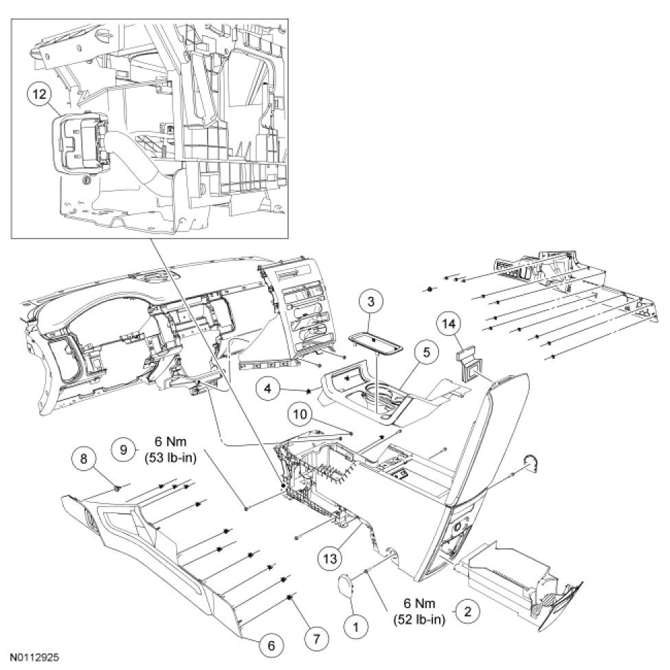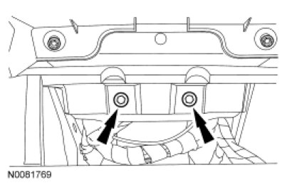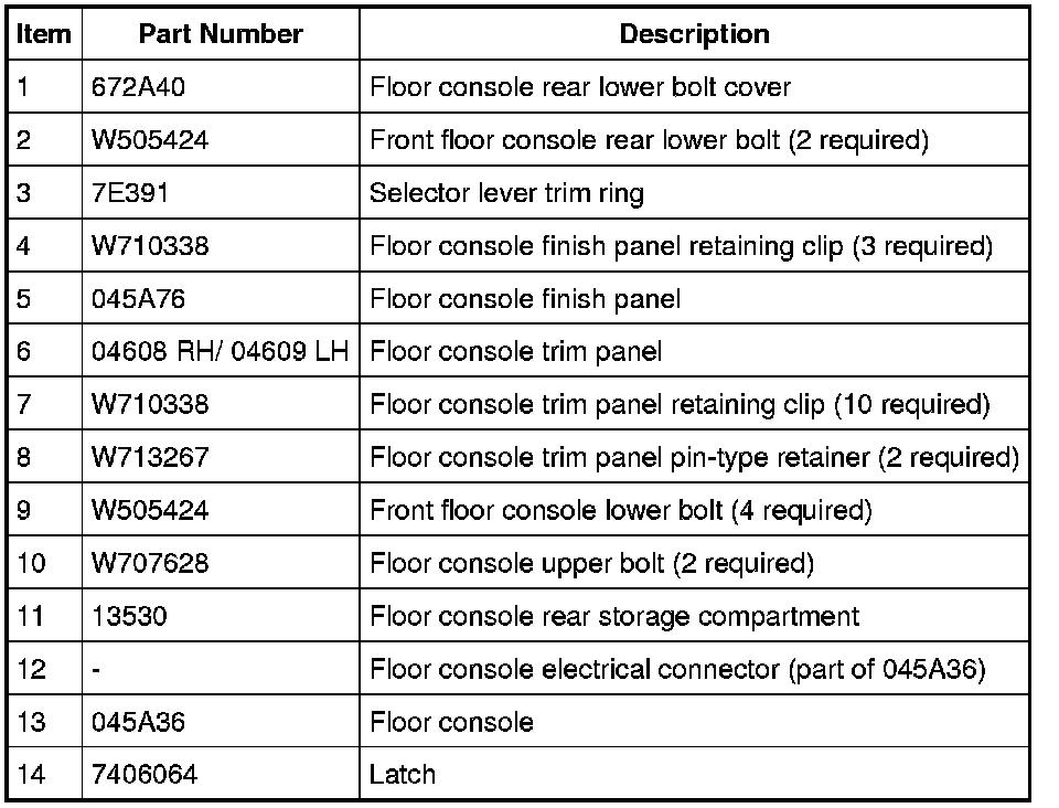 10. Pull the front of the LH and RH floor console trim panels downward to detach the trim panel from the pin-type retainers.