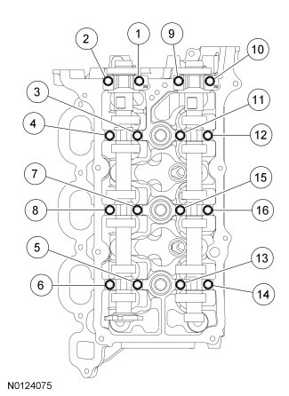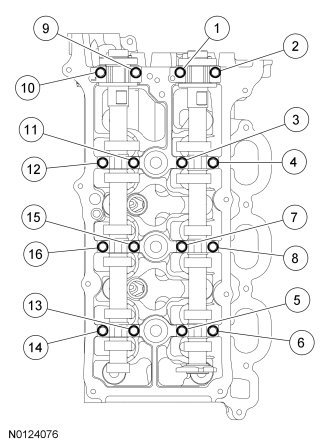 Install the 8 camshaft caps and the 16 bolts. Tighten the bolts in the sequence shown in the following stages: