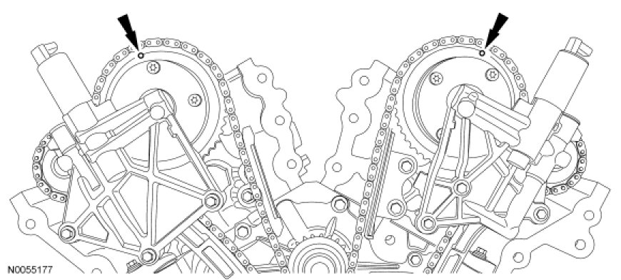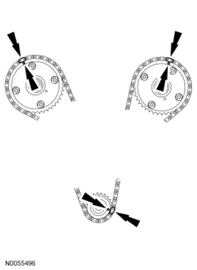 4. Install the primary timing chain with the colored links aligned with the timing marks on the VCT assemblies and the crankshaft sprocket.
