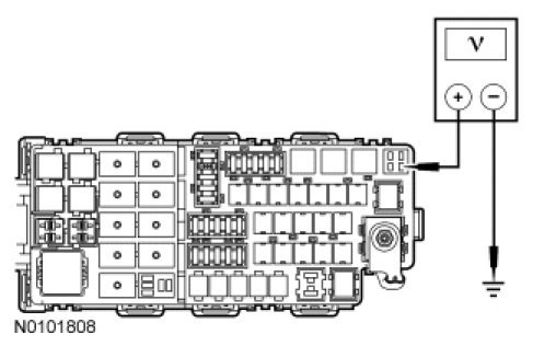 - Measure the voltage between A/C clutch relay socket, circuit SBB24 (VT/RD) and ground.