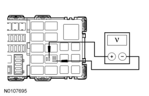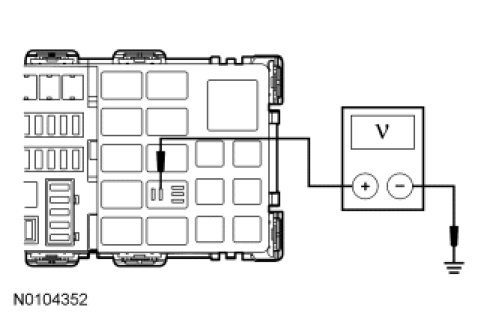 - Measure the voltage between the trailer battery charge relay pin 5, circuit SBB30 (BN/RD), BJB face side and the trailer battery charge relay pin 1, circuit GD120 (BK/GN), BJB face side.