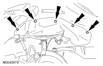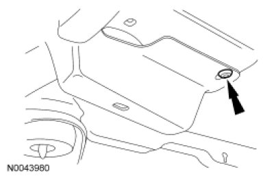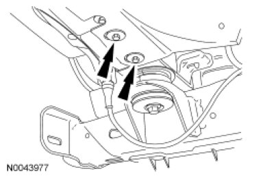 1. NOTE: The RH front fender splash shield electrical connector locators must be disconnected from the splash shield prior to splash shield removal. The LH front fender splash shield vacuum lines must be disconnected from the vacuum storage reservoir prior to splash shield removal.