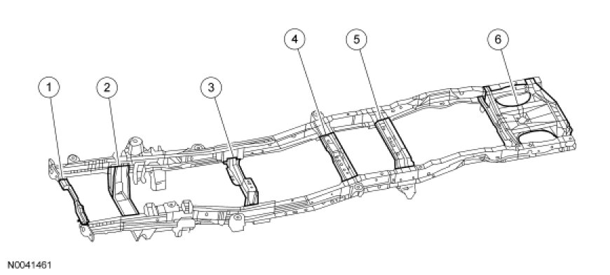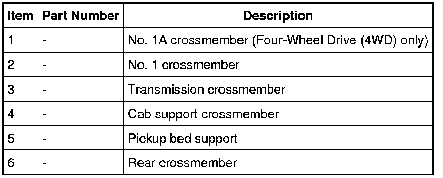 The No. 1A (Four-Wheel Drive (4WD) only) and the No. 1 crossmembers are welded to the frame side rails. The remaining frame crossmembers are riveted and/or bolted into place.