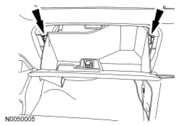 2. Depress the 2 side release tabs and allow the glove compartment to open completely.