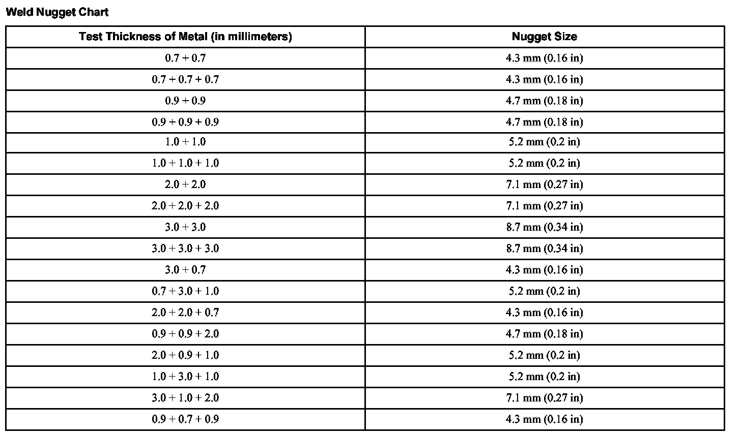 Weld Nugget Chart