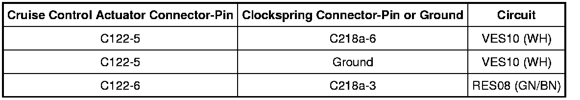 - Is the resistance less than 5 ohms between the cruise control actuator and the clockspring, and greater than 10,000 ohms between the cruise control actuator and ground?