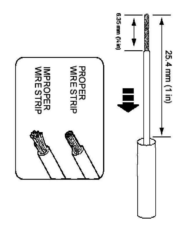 2. Strip 6.35mm (1/4 in) of insulation from each wire end, taking care not to nick or cut wire strands.