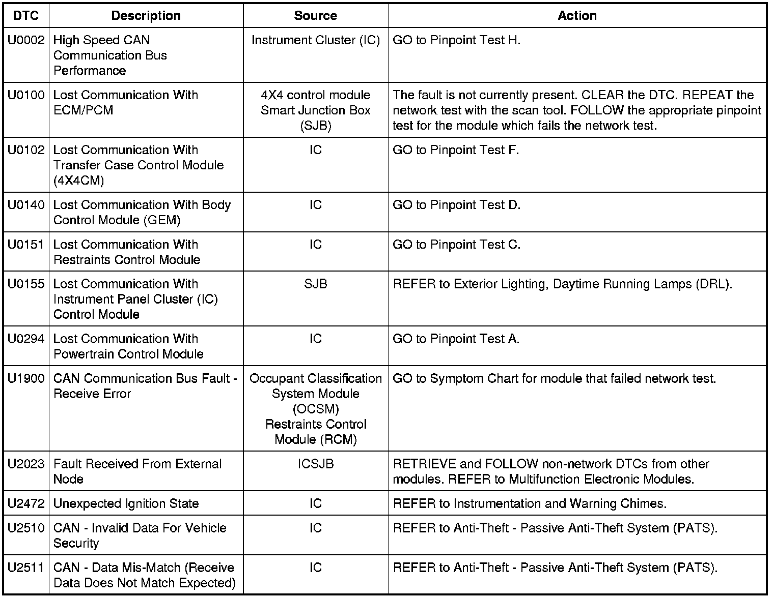 NOTE: Network DTCs (U-codes) are often a result of intermittent concerns such as damaged wiring or low battery voltage occurrences. Additionally, vehicle repair procedures such as module reprogramming often set network DTCs. Replacing a module to resolve a network DTC is unlikely to resolve the concern. To prevent repeat network DTC concerns, inspect all network wiring, especially connectors. Test the vehicle battery, refer to Battery, Mounting and Cables Testing and Inspection.
