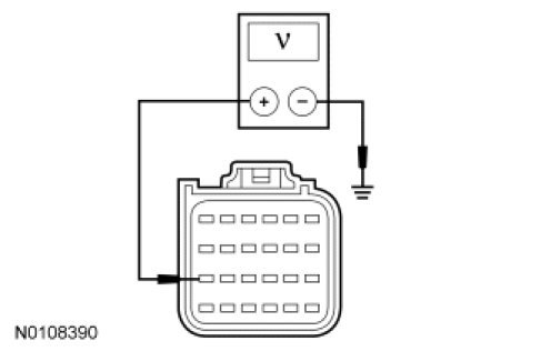 - Measure the voltage between the RCM C2041b-13, circuit CBP08 (GY/YE), harness side and ground.