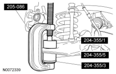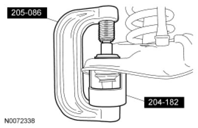 1. NOTICE: Do not damage the lower ball joint boot when installing the C-Frame and Screw Installer/Remover and Ball Joint Installer/Remover.