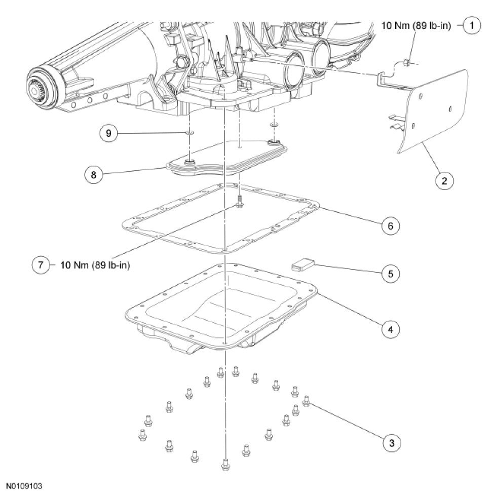 5. NOTE: The transmission fluid pan gasket is reusable. Clean and inspect for damage, if not damaged, the gasket should be reused.