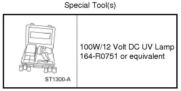 2. Start and run the engine until the transmission reaches its normal operating temperature. Using the 100W/12 Volt DC UV Lamp, observe the back of the cylinder block and top of the torque converter housing for evidence of transmission fluid leakage. Raise the vehicle on a hoist and run the engine at fast idle, then at engine idle, occasionally shifting to the DRIVE and REVERSE ranges to increase pressure within the transmission. Observe the front of the flexplate, back of the cylinder block (in as far as possible), inside the torque converter housing and the entire case until transmission fluid leakage is evident and the probable source of leakage can be determined.