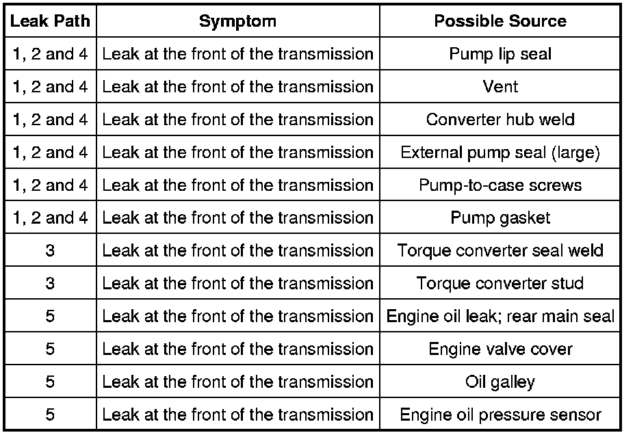 Leakage at the front of the transmission, as evidenced by transmission fluid around the torque converter housing part of the case, may have several sources. By careful observation, it is possible in many instances to pinpoint the source of the leak before removing the transmission from the vehicle.