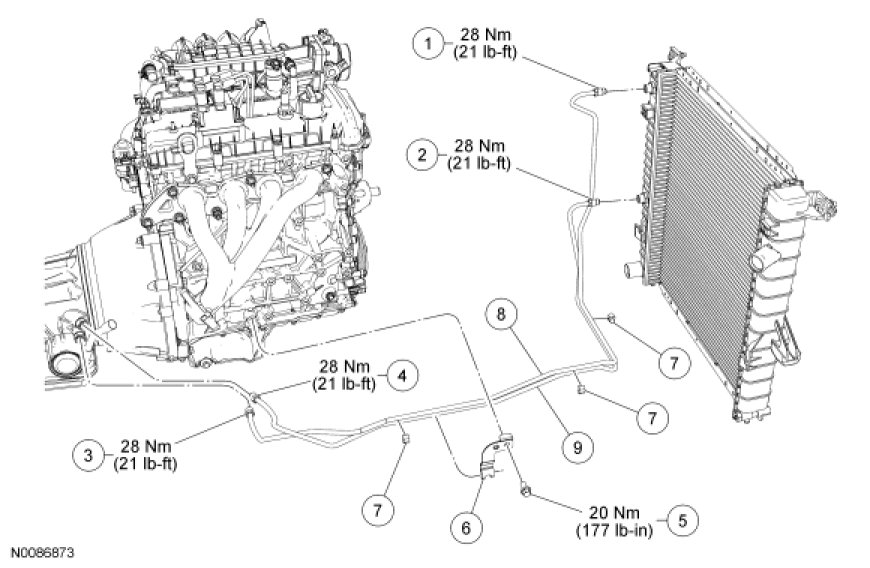 - Tighten the transmission fluid cooler tube fittings to 28 Nm (21 lb-ft).