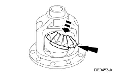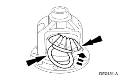 4. Engage the differential pinion gears with the differential side gears and rotate the pinion gears to align with the differential pinion shaft bore.