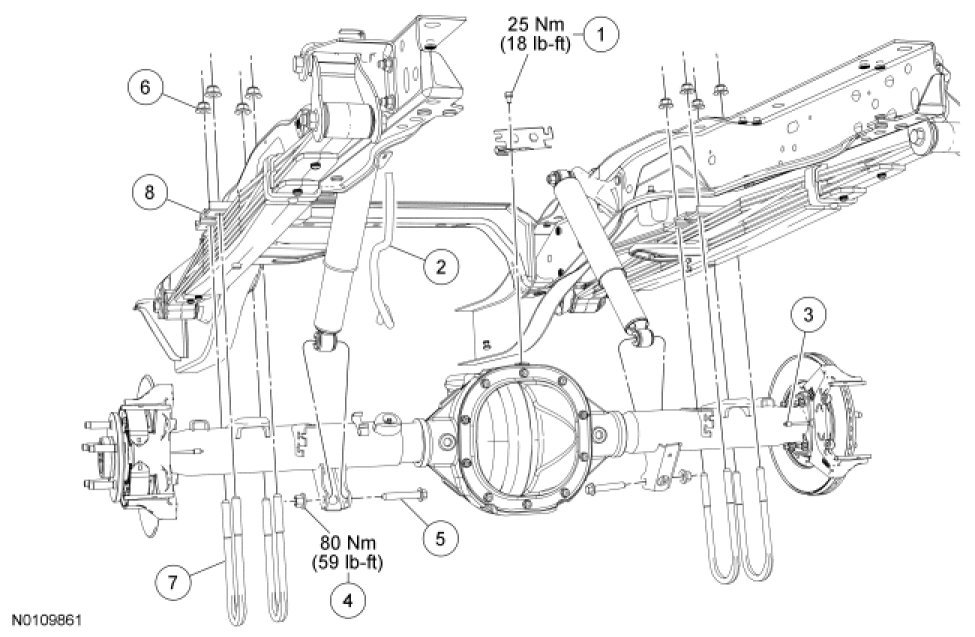 Remove and discard the 4 rear U-bolt nuts. Remove the U-bolts and the spring plate.
