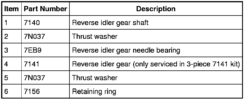 - The reverse idler gear is not serviced separately. A kit consisting of the output shaft reverse gear, the countershaft reverse gear and the reverse idler gear is available for service. All 3 gears in the kit must be installed. The replacement gears are not compatible with the existing gears.