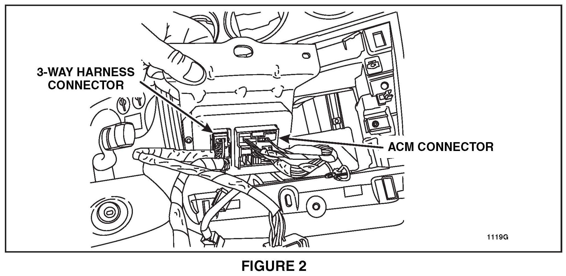 4. Disconnect the 3-way harness connector and the ACM connector. See Figure 2.