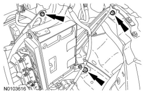 7. Remove the 3 bolts and the ACL bracket with the PCM bracket and PCM attached.