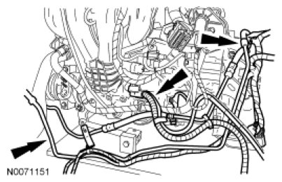 9. Position the 2 power steering tubes and the wiring harness as an assembly on the engine.