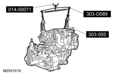 2. Using the Heavy Duty Floor Crane and Spreader Bar, position the engine and transaxle together. Install the 6 bellhousing-to-engine fasteners.